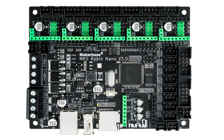 Robin Nano V3.1 is an upgraded version of Robin Nano V3.0, change the MCU from the STM32F407VGT6 to STM32F407VET6. What is more, Robin Nano V3.1 improves the anti-interference performance, such as adding Schottky diodes to the temperature measurement circuit and MOS circuit, and adding TVS protection to the power input.